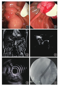 患者男,73岁,主因"反复腹痛、腹胀3年,加重2个月"入院。3年前因"十二指肠球部息肉"在我院行十二指肠息肉切除术及ERCP下胰管支架置入术。术中十二指肠乳头肿大(图1),可见分叶状肿物(图2)。术中选择性胆管造影及胰管造影后沿导丝置入7 Fr×9 cm胰管支架,置入鼻胆引流管至肝总管,胆汁流出通畅,过程顺利。病理结果提示:十二指肠乳头小肠绒毛管状腺瘤。术后3个月于我院ERCP下取出胰管支架。而后患者间断3次出现腹痛、腹胀,内科对症处理后可缓解。近2个月再次出现上腹部绞痛,腹胀,有加重趋势,性质同前,于当地医院行超声检查示:"胰管扩张,内多发性结石"。体重2个月下降10 kg。既往高血压病史30余年,9年前行左肾切除术。辅助检查:CA19-9 39.05 U/mL。腹部超声:肝囊肿,胰管增宽,胰管内多发强回声,左肾切除术后,右肾强回声,右肾囊肿。MRCP:胆总管中上段增宽(图3),主胰管及胰头部分支胰管全程显著扩张,粗细不均(图4)。胰腺实质萎缩,胰头部信号不均匀。超声内镜:胰腺萎缩,胰管全段扩张,胰头部胰管呈囊样扩张(图5),直径约0.8 cm,其内可见附壁高回声,后伴声影,直径约0.6 cm,胰体部胰管呈串珠样扩张,直径为0.7 cm,其内可见多发附壁高回声,直径约0.3 cm。住院期间择期为患者行ERCP+EST+ERPD。术中进镜至十二指肠降部,乳头呈瘢痕状态,切开刀配合导丝选择性胆管插管成功,胆管造影示胆管不扩张,切开刀配合导丝选择性胰管插管未成功,选择副乳头,切开刀配合导丝选择性胰管插管成功,胰管造影示胰头部胰管狭窄、胰体尾胰管扩张,沿导丝置入5 Fr×8 cm单猪尾支架于胰管(图6),位置满意,胰液排流通畅。术后无腹痛、发热等不适。术后即刻血生化结果:葡萄糖6.75 mmol/L,血淀粉酶正常。术后随访至今共17个月,患者恢复良好,未复发胰腺炎。