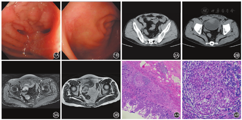 患者女,58岁,因"反复腹痛8年,加重伴浑浊尿2个月余"于2017年4月5日入院。患者腹痛主要为下腹部,位置稍偏右,呈隐痛,伴大便次数增多,2~4次/d,间断有黏液便。曾于当地行肠镜提示"回肠末端及大肠溃疡性炎症",服用美沙拉嗪肠溶片,症状一度好转,但2014年起停药,期间出现腹痛。2017年2月患者发现尿液颜色加深,有杂质,外观浑浊,伴尿频、尿急、排尿不尽感及轻微尿痛。既往有子宫肌瘤行全子宫切除病史。入院体检:腹软,下腹正中部位轻度压痛,无反跳痛,腹部未触及包块,移动性浊音阴性,肠鸣音4次/min。血常规示血红蛋白103 g/L,红细胞压积0.316。尿常规示白细胞反应(++),白细胞158.10/μL。尿液涂片:革兰阳性球菌呈中量(+++),真菌孢子呈中量(+++),革兰阴性杆菌少见(+)。骨髓涂片:骨髓增生极度减少,以红系和巨核细胞减少为主。骨髓活检:骨髓增生较低下,脂肪约占髓腔面积的75%,粒红比例大致正常,粒红系均以中晚幼阶段细胞为主;Ag(-),Fe(-)。当次住院肠镜示回肠末端肠腔管壁增厚,黏膜水肿呈结节样,管腔狭窄,从狭窄处至回盲瓣回肠段见散在数个少苔溃疡,并见瘢痕形成,致肠腔变形(图1A);回盲瓣变形,并见一薄苔溃疡,周边黏膜皱缩,0.4 cm×0.5 cm;盲肠见两个浅表小糜烂灶;全结肠黏膜散在充血水肿,直肠近端见散在多个浅表不规则溃疡,大小不等,并见一肉芽组织样小隆起(图1B)。病理检查示回肠末端黏膜慢性炎,回盲瓣呈慢性炎伴炎性渗出、坏死,且伴肉芽组织形成,符合克罗恩病(Crohn disease,CD)的典型表现。CT示回肠远段改变,考虑炎症性肠病可能性大,肠壁穿孔并累及膀胱;子宫未见显示(图2)。MRI示回肠远段肠壁增厚、穿孔并内瘘形成,考虑CD可能性大,形成炎性肿块累及膀胱前上壁;子宫缺如(图3)。2017年4月15日经首次多学科团队(MDT)讨论,认为病理未见干酪样坏死,且患者缺乏全身中毒症状,初步排除结核;综合患者的病史、腹部影像学及病理学检查,诊断其为"CD并回肠-膀胱瘘"的可能性大;由于CD为内科疾病,且患者因停药而导致复发,故可先进行内科保守治疗,建议使用生物制剂英夫利西单抗(infiximab,IFX)治疗,但患者因经济原因拒绝使用;由于骨髓象增生低下,故暂不使用硫唑嘌呤等免疫抑制剂,予美沙拉嗪,辅以调节菌群、保护肠道黏膜及纠正贫血等治疗。患者出院后腹痛有好转,但混浊尿等症状未见明显改善。2017年6月25日再次住院,第2次MDT讨论,认为该患者瘘管口径较大,内科保守治疗不理想,且存在骨髓抑制,免疫抑制剂的使用受限,因此具有手术适应证,遂于6月29日在全麻下行"回肠部分切除术+膀胱部分切除术+回盲部切除术"。术后病理:小肠及大肠黏膜呈慢性活动性炎症改变,炎症节段性加重,局灶炎症穿透肠壁全层,肌层坏死断裂,肉芽组织增生,呈裂隙状溃疡改变;固有层内多灶类上皮细胞增生形成肉芽肿,未见凝固性坏死(图4),符合CD表现。术后患者浑浊尿消失,偶有中腹痛。术后10 d余,患者腹部切口有红肿及渗液,腹部查体无压痛及反跳痛,肠鸣音正常。考虑为手术后伤口愈合不良,予伤口清创及抗生素预防感染。1周后患者切口愈合良好,腹痛明显缓解,偶有中腹胀,无浑浊尿,嘱门诊随访。目前予硫唑嘌呤50 mg(每日1次)、美沙拉嗪缓释颗粒1.0 g(每日4次)维持缓解。患者体重由术前42 kg上升至51 kg,红细胞沉降率由术前102 mm/h下降至16 mm/h,C-反应蛋白由21.2 mg/L上升至4.1 mg/L,血红蛋白由术后的86 g/L上升至98 g/L。