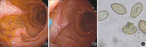 患者男,60岁,因"腹胀1个月,纳差7 d,发热1 d"入院。患者近1个月出现较明显腹胀,逐渐食欲下降,伴有餐后恶心,1 d前突然发热,体温最高达到39℃,不伴明显畏寒、寒战,无腹痛,无呕吐,无咽痛,无咳嗽、咯痰,无头痛,无肌肉痛,大便如常,尿色稍黄。起病前1个月自制药酒饮服,每天约半斤。近期无外出旅游。近期广州市内较多流感病例,患者家属中暂无感染者。患者有"高脂血症"10余年,无长期服药;无"肝炎、肺结核"等传染病史;无嗜酒史,平素喜欢吃鱼,但不吃鱼生。入院查体:体温39.6℃,心率89次/min,呼吸20次/min,血压142/81 mmHg(1 mmHg=0.133 kPa),神志清晰,体型偏胖,营养良好,皮肤无焦痂、斑丘疹、皮下出血斑点等,全身浅表淋巴结无肿大,巩膜无黄染,无咽喉充血,双侧扁桃体无肿大和渗出,胸廓正常,呼吸运动对称,双肺叩诊音清,双肺呼吸音清,无干湿罗音,心浊音界无扩大,心率89次/min,律齐,无心包摩擦音,各瓣膜区无病理性杂音,腹稍膨隆,未见胃肠型或蠕动波,无腹部静脉显露,全腹软,右上腹有压痛,无反跳痛,无肝区叩痛,墨菲征可疑阳性,移动性浊音阴性,肠鸣音4次/min,双下肢无浮肿,腓肠肌无压痛。血常规:白细胞7.33×109/L,中性粒细胞比率0.646,单核细胞比率0.112,嗜酸性粒细胞比率0。肝功能:ALT 94.0 U/L,AST 98.0 U/L,GGT 85 U/L,TBIL和DBIL正常。C反应蛋白(CRP) 76.0 mg/L,降钙素原(PCT) 2.32 ng/mL。尿常规:尿胆原(+++),尿蛋白(++),24 h尿蛋白0.62 g。粪便常规+隐血(-)。肝炎系列(-),肺炎九项(-),EB病毒抗体(-),TORCH四项(-),肥达氏反应(-),外斐氏反应(-),甲型流感抗原(-),乙型流感抗原(-)。两次血培养(-)。腹部超声:脂肪肝并肝稍大,胆囊内胆汁淤积;脾、胰未见异常声像图;门静脉、肝静脉血流未见异常。腹部CT:轻度脂肪肝,肝脏散在小囊肿;前列腺钙化;胆、胰、脾、双肾、双肾上腺及膀胱未见明显异常。患者入院后予多烯磷脂酰胆碱护肝和观察热型,入院后5 d内均有39℃以上发热,第5天达最高(40 ℃),热型呈弛张热,不排除感染性发热,入院后第3天予左氧氟沙星静脉滴注,第5天联合应用头孢噻肟钠舒巴坦钠静脉滴注,第6天体温迅速下降至正常后未再发热,但仍腹胀、食欲减退。复查血常规:白细胞10.65×109/L,中性粒细胞比率0.261,淋巴细胞比率0.669,嗜酸性粒细胞比率0.010。尿常规:尿蛋白(±)。粪便常规+隐血(-)。CRP 18.8 mg/L。PCT 0.27 ng/mL。肝功能:ALT 97.0 U/L,AST 66.0 U/L,GGT 214 U/L,TBIL和DBIL正常。高度怀疑急性胆管炎,不排除肝吸虫感染,于入院第14天行胃镜引导下十二指肠液引流术(图1),收集A、B、C三管胆汁送实验室查找寄生虫卵,3管肝吸虫卵均为阳性(图2)。建议患者服吡喹酮驱虫治疗。