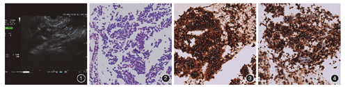 查胰腺增强磁共振(MRI)示"十二指肠乳头内下方胰头钩突后方区域异常信号结节灶"。2015年12月患者因左鄂部黏膜恶性黑色素瘤伴淋巴结转移行手术切除加化疗,因化疗副反应明显后停止化疗。2018年1月患者因左锁骨上淋巴结疼痛行淋巴结切除,术后病理提示符合黑色素瘤淋巴结转移。进一步明确胰头钩突部占位性病变性质,患者于2018年8月27日入院诊治,完善相关检查并排除禁忌后于2018年8月29日行胰腺内镜超声引导下细针抽吸术(EUS-FNA),超声扫描见胰头部胰管扩张,内径约3.5 mm(图1),胰腺钩突部见一占位,内部回声不均匀,病灶中央中等回声为主,周边低回声为主,大小约1.9 cm×1.8 cm,彩色多普勒血流图像(color doppler flow imaging, CDFI)提示病灶血供丰富,六氟化硫微泡剂造影提示动脉期实质期高增强,血流多普勒见穿刺路径,未见明显血流,用22 G穿刺针(波士顿科学,美国)刺入胰腺钩突部肿块,来回提插取得组织条长约10 cm,送检涂片、细胞学及组织学。术后液基细胞涂片提示:恶性肿瘤细胞,胞浆内可见色素沉着,黑色素瘤转移可能。病理结果示:胰腺钩突部符合恶性黑色素瘤转移,CK(pan)(-),Ki-67(20%+),P63(-),HMB 45(+),Melan A(+),S-100(-)(图2,图3,图4)。证实为恶性黑色素瘤胰腺转移,后转至我院化疗科继续治疗,查浅表淋巴结超声提示:左锁骨上淋巴结肿大。颈部CT示右颈部颌下团块影(大小约3.1 cm×1.7 cm),淋巴结转移考虑。头颅CT平扫未见明显异常改变。全身骨骼ECT示骨骼未见明显骨质代谢异常。诊断:左腭部恶性黑色素瘤(术后,化疗后)伴颈部淋巴结转移,胰腺转移,予纳武单抗220 mg化疗已11次。患者现继续治疗和随访中。