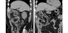 IMP尽管少见,但其在影像学尤其是腹部CT上有一定特色表现,典型病例提示受累结肠段增厚、僵硬,肠管及四周出现多发、细条状多发钙化,肠系膜上静脉分支可有不同程度细条状钙化。肠镜可见肠腔表面黏膜静脉曲张淤血,呈特殊暗紫色,触之易出血,结肠皱襞消失,伴有多发糜烂及溃疡[3,6]。