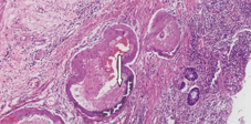 IMP是一种极为少见的缺血性肠炎,国内外文献多为个例报道[1,2,3]。其以结肠肠壁增厚、结肠壁静脉管壁钙化及肠系膜上静脉分支不同程度钙化为主要病理表现[3,4]。IMP临床上可见腹痛、腹泻、便秘、便血等非特异性表现,也有以肠梗阻为首发的报告,极少数患者可出现肠穿孔。董惠和孟立娜[5]2015年总结国内外文献报道的IMP 29例,其中15例患者同时累及升结肠和横结肠,7例累及升结肠,说明该病多累及右半结肠,可以表现为反复右侧腹痛。由于IMP无明确特征性表现,容易误诊为其他常见消化道疾病,本例患者初次就诊就怀疑阑尾炎。