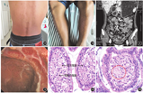 患者男,33岁,因"下腹痛2个月"入院。患者自2个月前开始出现下腹部疼痛,绞痛性质,以右下腹为主,伴脐周疼痛,大部分时间可耐受,有阵发性加重,尤以晚上明显,同时伴有纳差、嗳气,偶有黏液便,无咳嗽咳痰及发热、盗汗,体重下降5 kg。入院前外院胃镜和结肠镜均未见明显异常征象,未行活检病理检查。患者有肺结核史,抗结核治疗痰检转阴,停药2年后于2018年痰检再次出现阳性,痰培养提示甲哌力复霉素(商品名:利福平)耐药。予以帕司烟肼+氯法齐明+环丝氨酸+莫西沙星抗结核治疗至今。体格检查发现患者面部皮肤发红,背部和双下肢胫前呈黑色鱼鳞状改变(图1);全身浅表淋巴结未触及肿大;腹部柔软,无压痛及反跳痛,未触及包块,移动性浊音阴性。结核感染T细胞斑点试验阳性。铁5.60 μmol/L,转铁蛋白饱和度10.77%,总铁结合力44.22 μmol/L。大便常规+隐血、大便培养、肿瘤标志物、自身免疫抗体等各项实验室检查均未见异常。入院后胸部摄片示两肺中上野陈旧性结核;腹部立位平片未见明显异常。小肠造影CT检查示空回肠多发管壁增厚,黏膜层见均匀强化,肠系膜根部见多发中小淋巴结(图2)。经肛小肠镜检查见回肠黏膜呈红棕色及褐色改变,小肠绒毛呈颗粒状(图3);所见结肠黏膜无明显异常改变。回肠活检病理报告:黏膜慢性炎伴糜烂。