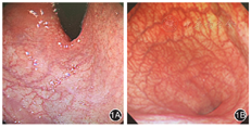 综上,通过学习此病例以及复习相关文献,我们认为内镜医生应提高对G-NENs的内镜下表现的认识,特别是加强对微小病灶的识别。应当密切结合患者病史、临床特征,仔细规范地完成胃镜检查,对有易患G-NENs风险者(如幽门螺杆菌检查呈阴性、胃体为主的慢性萎缩性胃炎患者,或者自身免疫性胃炎,且病史>2年的患者),胃镜检查时即使内镜下无肉眼可见的隆起型病灶,也应行随机多点活检(特别是对胃体四壁处),以提高G-NENs诊断的阳性率。而对于明确诊断为胃微小神经内分泌肿瘤的患者,长期内镜随访时可考虑行放大胃镜+窄带成像技术以及内镜下的染色技术以避免遗漏胃微小病灶。