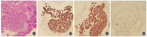 遂于我院行首次胃镜检查,诊断:慢性萎缩性胃炎(胃体、胃底)(图1A)。胃体随机活检,病理检查显示慢性中度炎症,重度肠上皮化生,局灶固有层见密集细胞形成巢状结构,细胞胞浆减少,细胞核呈圆形、深染,未见明确核分裂像。免疫组化检查示AE1/AE3(+)、CD56(+)、CgA(+)、SYN(+)、Ki-67(+,约1%),符合神经内分泌肿瘤(1级)。为明确诊断复查胃镜,见胃体、胃底黏膜明显变薄,红白相间,以白为主,黏膜下血管网透见,胃窦黏膜正常(图1B),仍诊断:慢性萎缩性胃炎(胃体、胃底)。胃窦、胃体前后壁、胃体大小弯、胃底随机多点活检,病理检查示胃底、胃体呈末期慢性萎缩性胃炎,伴广泛肠化;胃体小弯、胃体后壁、胃体大弯有肠嗜铬样细胞增生,接近神经内分泌肿瘤;胃体前壁呈神经内分泌肿瘤G1(类癌);胃窦、胃角呈轻度慢性炎,未见萎缩。免疫组化检查示胃体前壁CgA(+)、SYN(+)、CD56(+/-)、AE1/AE3(弱+)、Ki-67(+,约2%),符合神经内分泌肿瘤(1级)(图2)。目前诊断:1型胃神经内分泌肿瘤(gastric neuroendocrine neoplasms,G-NENs)G1级;自身免疫性胃炎;Graves病。治疗:建议每1~2年定期复查胃镜+活检随访G-NENs。