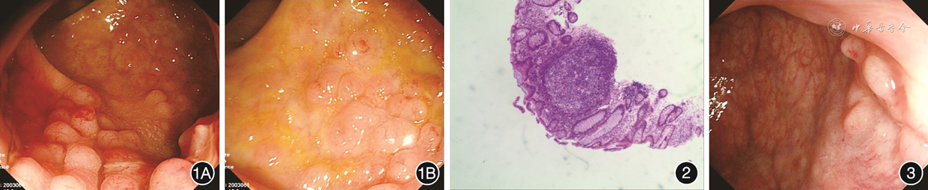 患者男,28岁,因“间断腹泻伴下腹痛2个月”就诊于北京大学人民医院消化内科门诊。患者2个月前出现腹泻,3~4次/d,为黄色糊状便,伴下腹隐痛,无黏液血便,无发热,无恶心、呕吐。血常规、生化、凝血及C反应蛋白检测未见明显异常,感染四项(乙肝、丙肝、梅毒、艾滋病)检测未见明显异常。肠镜检查可见距肛门口3 cm以下直肠黏膜弥漫性2~4 mm结节样病变伴红斑(图1),直肠活检提示黏膜重度慢性炎,淋巴组织增生(图2)。追问个人史,患者诉有多个同性性伴侣,有多次无防护措施肛交史。结合患者肠镜结果及个人史,完善沙眼衣原体抗体检测,结果为阳性,提示沙眼衣原体感染,诊断为衣原体直肠炎。门诊给予阿奇霉素500 mg/d 口服治疗,1周后患者腹泻、腹痛症状逐渐消失。3个月后复查肠镜,可见直肠病变较前明显好转(图3)。
