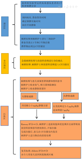 自2019年12月起,武汉陆续出现不明原因肺炎病例,经病毒分型检测发现其致病原为一种新型冠状病毒[1,2,3],新型冠状病毒具有潜伏期长、传染性强、起病隐匿、人群普遍易感等特点[4]。由于儿童对各种医疗操作的心理恐惧,不能配合完成检查,需要对儿童提供镇静等舒适化医疗服务。在有感染相关风险,且有严格功能区域划分的特殊环境下的镇静操作,对麻醉相关医务人员都是挑战,因此,我们根据国家针对新型冠状病毒肺炎的各种规范和指南,制定儿童疑似新型冠状病毒肺炎CT检查的镇静流程、镇静方案、镇静相关物品的准备,核查方案及制定应急方案,并且对相关人员进行培训,现将我们的方案和经验分享如下。