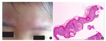 患儿女,9岁,因眉额部皮肤红斑丘疹加重6年于2014年5月就诊。患者出生时即发现眉间有轻度红斑,当时未引起注意。红斑持续不退并逐渐明显,近6年来,持续扩大至双侧眉毛内,并出现角化丘疹及轻度萎缩。同时于双下颌、双侧颞部、口周以及双侧上臂外侧出现角化性丘疹而就诊,无任何自觉症状。患儿既往体健,家族中无类似疾病。