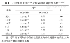 其中,A代表注射的18F-FDG的放射性活度,其单位为MBq或mCi,而ΓEEDG、ΓTEDG分别代表在国际辐射防护委员会(International Commission on Radiological Protection, ICRP)第106号出版物[4]中所推荐的不同年龄个体与不同器官的注射活度与吸收剂量转换系数,其单位为mGy/MBq;WT是指不同器官的权重因子[5]。
