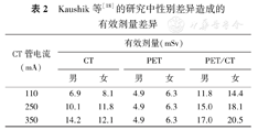 1. CT扫描序列的差异。在PET/CT全身检查中,CT的主要功能在于解剖学定位以及衰减校正。近年来,很多医院配备的PET/CT都并联了多层螺旋CT,使受检者在行PET/CT检查时,可以加做包括胸部诊断性CT、强化CT(contrast-enhanced CT,CECT)等较高剂量的CT检查,这在提升诊断准确性的同时,增加了对受检者的辐射。在Mahmud等[3]的研究中,19位受检者同时接受常规的平扫CT(non-contrast enhanced CT,NECT)与CECT,NECT有效剂量为0.61~43.80(7.89±10.00) mSv,CECT为7.01~27.56 (10.83±4.45) mSv,PET为5.45~7.38(6.33±0.70) mSv,总有效剂量平均为15.00~77.38(25.05±13.70) mSv。
