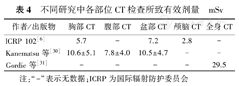 不同研究中各部位CT检查所致有效剂量mSv