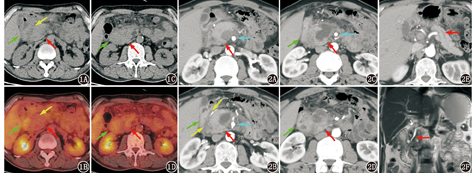 患者男,48岁,于饮酒后出现间断上腹痛、背痛3个月余。实验室检查提示血常规、肝肾功正常,血清淀粉酶290 (括号内为正常参考值范围,下同;25~115) U/L,血清脂肪酶1 294 (73~393) U/L,血清癌胚抗原(carcinoembryonic antigen, CEA;0~5 μg/L)、糖类抗原(carbohydrate antigen, CA)19-9 (0~37 kU/L)、免疫球蛋白(immunoglobulin, Ig)G亚类均正常。腹部超声提示胰头囊实性占位,大小约4.7 cm×2.7 cm,壁上见多处乳头状突起,边界欠清,彩色多普勒血流显像(color Doppler flow imaging, CDFI)未见明确血流信号。外院腹部增强CT提示胰头占位并周围渗出,周围局部包裹性积液,病变周围多发稍增大淋巴结。腹部18F-脱氧葡萄糖(fluorodeoxyglucose, FDG) PET/CT显像结果、MRI及增强CT图像见图1,图2。