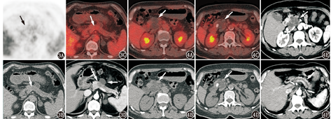 胰头病变为囊实性,常见的肿瘤性病变包括胰腺导管腺癌、胰腺神经内分泌肿瘤、胰腺导管内乳头状黏液性肿瘤(intraductal papillary mucinous neoplasm, IPMN)、胰腺实性假乳头状瘤、胰腺浆液性囊腺瘤(囊腺癌)、胰腺黏液性囊腺瘤(囊腺癌)等,非肿瘤性病变主要为胰腺炎。虽然本例胰头病变FDG代谢未见明显增高,但恶性肿瘤中胰腺导管腺癌、胰腺低级别神经内分泌肿瘤、IPMN都有可能表现为完全正常的FDG代谢活性(图3,图4),因此FDG代谢不高不能排除胰腺恶性肿瘤的可能性。