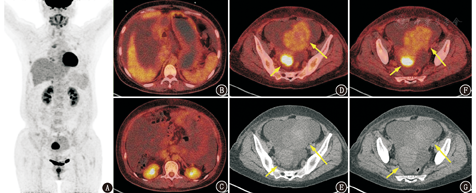 卵巢无性细胞瘤、卵黄囊瘤等生殖细胞来源恶性肿瘤好发年龄为青少年,一般<20岁,与本例流行病学不符。卵巢性索-间质来源肿瘤可为良性或恶性,即便为恶性通常也为低级别,与本例的代谢特点较符合,而卵巢颗粒细胞瘤由于可分泌雌激素或孕激素,常常以相应的内分泌症状起病,包括子宫内膜增生、阴道出血等,本例患者无雌激素相关症状,不支持,因此若考虑性索-间质肿瘤则更有可能为卵泡膜纤维瘤。卵巢转移瘤多发生于胃肠道肿瘤等易发生腹腔种植转移的肿瘤,值得注意的是,当胃肠道肿瘤为代谢活性不高的类型(如胃印戒细胞癌)时,其卵巢的转移灶也可代谢不高或仅轻度升高(图2,图3),同时腹膜、网膜的种植转移灶也可能为假阴性。本例附件区病变代谢不高,伴大量腹盆腔积液,患者为老年女性,因此恶性病变中需高度警惕卵巢转移瘤,在查看图像时需特别关注胃肠道,需判断检查时胃充盈程度如何、胃壁代谢是否均匀、胃壁是否有局部增厚、胃壁有无可疑的僵硬等表现,另外还需仔细观察腹膜、大网膜是否有结节、絮状影、局部增厚等隐匿性种植转移的表现。本例胃肠道未见异常,也未发现隐匿性的种植病灶,临床上血清CA125高而CEA正常,暂无支持性证据,若有胃镜检查结果则可更有把握地排除这一诊断。肉瘤的代谢程度变异较大,取决于具体的病理类型,脂肪肉瘤等恶性程度较低的肉瘤可以仅有轻中度代谢增高,而像横纹肌肉瘤等恶性程度较高的肉瘤代谢常明显增高,本例附件区占位代谢轻中度增高,若考虑肉瘤则可能为低级别的类型。