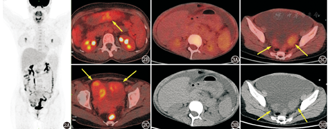 患者女,54岁,主诉腹胀1个月。1个月前患者无明显诱因出现腹胀,伴食量减少,后腹胀逐渐明显,腹围增加。外院腹部B超提示腹盆腔大量积液,盆腔内实性肿物,大小为7.0 cm×6.7 cm,子宫多发肌瘤;腹部增强CT提示左附件区混杂密度影,呈分叶状,增强后不均匀明显强化,考虑卵巢来源可能性大。血清糖类抗原(carbohydrate antigen, CA)125为260.57(正常范围0~35) kU/L,癌胚抗原(carcinoembryonic antigen, CEA)、CA19-9正常。18F-脱氧葡萄糖(fluorodeoxyglucose, FDG) PET/CT显像(图1)可见盆腔内左附件区肿物,呈分叶状,密度不均匀,大部分为软组织密度影,大小为7.4 cm×9.8 cm,中央密度略高,病变代谢活性轻度升高(高于肌肉,略低于肝脏),最大标准摄取值(maximum standardized uptake value, SUVmax)3.7,代谢不均匀,病灶中央密度略增高区为代谢减低区;子宫后壁另见一代谢异常增高的肿物,位于宫体后缘,密度与子宫体相同,大小为3.3 cm×2.4 cm,SUVmax 12.8;此外腹盆腔可见大量积液。在胸部可见双肺胸膜下区多发代谢轻度增高的斑片影。