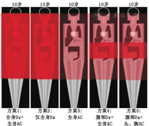 根据国际辐射防护委员会报告103的DLP换算因数来估算每个区域的有效剂量(effective dose, ED)[29]。考虑了以下5种方案(图2):(1)躯干部位的Dx以及非Dx扫描;(2)躯干部位Dx扫描;(3)躯干部位非Dx扫描;(4)腹部Dx扫描(从膈肌上方到骨盆上方的区域)以及躯干部位非Dx扫描;(5)包括头部、胸部非Dx扫描以及腹部Dx扫描的多序列扫描。估算每个区域的ED值,并根据不同扫描情况对这些值进行求和。例如,如果感兴趣区域是1例10岁儿童患者的腹部,应用上述多序列扫描方式(图2方案5),将非Dx CT扫描头(颈)部和胸部的ED值和腹部Dx CT扫描的ED值(分别为0.018、0.0517、1.24 mSv)相加得到总ED值。