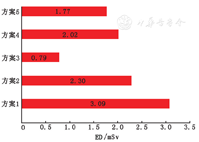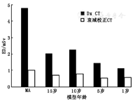 图4显示了上述5种情况中10岁患者的ED估算值。对于接受第5种扫描方式的患者,ED值估算为1.77 mSv,小于第1、2、4种扫描方式的ED估算值(3.09、2.30、2.02 mSv)。以上数据表明将非Dx以及Dx CT扫描合并为单一的多序列采集方式能够减少辐射剂量,与第1、2、4种扫描方式相比,分别减少了44%、23%和12%。