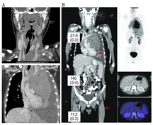 3.案例分析。用1个13岁患者的病例进一步说明多序列扫描方案。该患者在行颈部和胸部Dx CT扫描(图5A)及相应活组织检查(简称活检)后被诊断为淋巴母细胞淋巴瘤。为了完成分期,除腹部(骨盆)的Dx CT扫描外,患者还进行了躯干18F-FDG PET/CT显像。尽管辐射剂量已降低到合适的范围,笔者仍没有重复进行颈部和胸部Dx CT扫描,因为这些部位已经在最初诊断时完成了扫描。对患者进行了多序列PET/CT显像:先行颈部和胸部非Dx CT扫描,然后进行腹部和骨盆Dx CT扫描。另外进行的大腿以上部位非Dx CT扫描用于PET扫描时床位的解剖定位(图5B)。颈部和胸部的非Dx CT扫描不仅可以对同一区域更早进行的Dx CT扫描进行补充,还可以用于PET的衰减校正以及解剖定位。患者进行腹部(骨盆)Dx CT扫描的价值可经18F-FDG显像证实——右肾有18F-FDG低摄取灶,如果不进行对比增强Dx CT扫描显示该低衰减病变,则很难将其与18F-FDG的肾脏清除相区分。该转移性病变在非对比、非Dx CT图像上会显示不明显。非Dx CT扫描的区域,即颈部(胸部)及双下肢接受到的辐射剂量(0.3、0.3 mSv)明显低于进行标准Dx CT扫描的腹部(骨盆)区域的剂量(3.4 mSv)(图5B)。总体而言,本机构的多序列CT扫描方案的应用为临床医师提供了有价值的分期信息,同时降低了患者所受辐射剂量并节省了患者的时间。