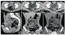 脐尿管癌主要应与以下疾病鉴别:(1)膀胱癌:好发于膀胱三角区及侧后壁,多宽基底与膀胱壁相连,突入腔内生长;多为实性肿块,增强扫描明显强化,早期及延迟PET/CT显像多呈FDG异常高摄取;(2)转移性腺癌:多来源于肠癌、前列腺癌,患者一般有恶性肿瘤史,18F-FDG PET/CT检查可较灵敏地发现其他部位恶性肿瘤;(3)感染性病变(如结核、脓肿):病灶周围脂肪间隙内多出现斑片、絮状及纤维条索影,并呈明显渗出性改变,且患者多具有一些相关临床症状[5,14,15]。另外,还应与残余脐尿管异常(如瘘、憩室)、脐尿管良性肿瘤(如腺瘤、囊腺瘤、纤维瘤)、膀胱嗜铬细胞瘤等进行鉴别。如为女性患者还应考虑子宫内膜异位症的可能。