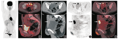 患者男,27岁,3个月前因肉眼血尿在当地医院行膀胱镜检查,于膀胱底部见2.0 cm×2.5 cm乳头状肿物,质脆,触之易出血。随后行经尿道膀胱肿瘤电切术,术后病理示膀胱浸润性腺癌,浸润至固有膜,提示临床关注病灶是原发还是转移性,有否腺癌病史,特别是大肠癌、前列腺癌病史。术后患者继续出现肉眼血尿,入住本院进一步诊治。体格检查无特殊,肿瘤标志物[癌胚抗原(carcinoembryonic antigen, CEA)、甲胎蛋白(alphafetoprotein, AFP)、铁蛋白(ferritin, FERR)、糖类抗原(carbohydrate antigen, CA)125、CA15-3、CA19-9、总前列腺特异抗原(total prostate specific antigen, tPSA)、游离前列腺特异抗原(free prostate specific antigen, fPSA)、fPSA/tPSA、鳞状细胞癌(简称鳞癌)抗原(squamous cell carcinoma antigen, SCCA)、细胞角蛋白19片段(cytokeratin 19 fragment, CYFRA21-1)、CA72-4、神经元特异性烯醇化酶(neuron-specific enolase, NSE)]、肝肾功能电解质全套及大便常规均未见异常。原病理切片会诊意见为:膀胱中等分化腺癌,结合免疫组织化学检查结果,考虑肠道来源可能性大。本院CT泌尿系统成像检查(图1)示膀胱顶前壁实性肿块,突向膀胱外生长,周围组织间隙较清晰,大小为1.2 cm×2.4 cm×3.1 cm,呈明显不均匀强化。为进一步明确病变性质、查找膀胱外可疑原发灶及其他部位转移灶,行18F-脱氧葡萄糖(fluorodeoxyglucose,FDG)PET/CT(德国Siemens mCT-s64型)全身显像。检查前患者禁食6 h、测血糖(5.6 mmol/L),静脉注射18F-FDG 229.4 MBq(患者体质量58 kg),平静休息1 h后显像。嘱患者口服呋塞米20 mg、多饮水、多排尿,以促排膀胱尿液放射性,2 h后行腹盆腔延迟显像(检查前饮水憋尿),影像表现(图2):膀胱顶前壁软组织肿块,18F-FDG摄取异常增高,早期及延迟最大标准摄取值(maximum standardized uptake value, SUVmax)分别为24.8、26.7;双侧盆壁未见明显肿大淋巴结;肠管及全身其他部位未见明显异常18F-FDG高代谢灶。PET/CT显像提示膀胱恶性肿瘤性病变,未见淋巴结及远处转移。随后的肠镜检查未发现明显异常。最终行腹腔镜下膀胱扩大切除术及双侧盆腔淋巴结清扫术,术后病理检查示:膀胱中等分化脐尿管腺癌,肿瘤从膀胱浆膜层浸润至固有层并伴坏死及多核巨细胞反应;双侧盆腔共17枚淋巴结未见癌转移;脐周皮肤未见癌浸润。