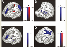 应用空间协方差分析在PD、MSA、PSP和CBD患者中建立上述疾病相关的脑代谢网络,可获得上述同样的结果。这些疾病相关脑网络模式(即PD、MSA、PSP和CBD相关模式;图3)被证明是具有高度可重复性的,与疾病的严重程度和持续时间相关(尽管在PD、MSA和PSP中存在一定程度的差异),并可在队列水平上对疾病进行前瞻性的鉴别诊断[55,57,58,59,60]。此外,这些模式在不同的独立组间样本中也得以验证[61,62,63]。PD相关模式的表达值与纹状体多巴胺能完整性呈负相关(6-18F-氟-L-多巴PET评估)[64],并且在早期PD患者,即偏侧性PD患者中已表现出明显的增高[65]。类似的是,最近的研究显示PD相关模式的表达值也在快速眼动睡眠行为障碍中出现增高[66,67],成为预测PD或DLB的重要因素(用灌注SPECT评估[66])。与脑代谢变化(即苍白球、感觉运动皮质和小脑的代谢减少;楔前叶的代谢增加)和症状改善相符的是,PD相关模式的表达也随着左旋多巴给药和PD丘脑底核的深部脑刺激出现下降[68]。因此,脑葡萄糖代谢的协方差模式为疾病的早期诊断和治疗监测提供了有趣的、客观的生物标志物。