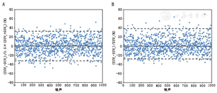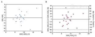有另一种替代统计学方法设计重复性测量差异标准差(standard deviation, SD)的应用。其数据可以很方便地使用Bland-Altman散点图(图1)表示,该图中2次重复测量值的差异以两者的平均值(