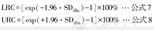 其中LRC是RC下限值,URC是RC上限值,SDdln指的是以对数数量级表示的差异性的SD。通过将以公式2中(相对于2个测量值的平均值)的单位表示的对称的RC限值转换为以公式6中(相对于单基线测量值)单位表示的对应值,即可得到类似的非对称限值。如以下公式所示: