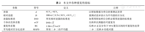 重复性测量研究中,SUV1和SUV2代表同一肿瘤2次显像研究测得的SUV,两者的差用d表示,计算公式如下: