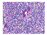 患者男,37岁,因"双侧腮腺肿大伴疼痛17个月余,加重1个月余"入院。患者17个月前发现双侧腮腺及下颌角处无明显诱因肿大,并逐渐增大,伴胀痛、发痒。自述双眼干涩及轻度口干,部分皮肤颜色呈淡褐色改变,伴瘙痒。无发热等其他病史。体格检查:躯干、四肢广泛分布直径约0.5 mm左右的淡褐色丘疹,部分抓破结痂,小腿部位见少量红斑;双侧腮腺及下颌角处肿大明显,质韧,皮温高,伴有触痛;双侧颌下及颈部可扪及数枚肿大淋巴结,质韧,活动度差,触之无痛感;口唇无明显紫绀,张口受限。实验室检查:WBC计数17.7(括号中为正常参考值范围,下同:3.5~9.5)×109/L、嗜酸性粒细胞计数1.00(0.02~0.52)×109/L,中性粒细胞计数13.2(1.8~6.3)×109/L,免疫球蛋白(immunoglobulin, Ig)E 8.7×107(<1×106) U/L,乳酸脱氢酶426(120~230) U/L,超敏C反应蛋白12(<6) mg/L,红细胞沉降率16(0~15) mm/1 h,肝肾功能、男性肿瘤系列(包含癌胚抗原及铁蛋白等)、IgG亚型(IgG4)测定、干燥综合征相关自身抗体等未见明显异常。彩色超声示双侧腮腺弥漫性损害,双侧颈部淋巴结肿大。CT示双侧涎腺肥大,密度增高,腺体明显均匀性强化,考虑炎性反应并颈部淋巴结反应性增生。18F-脱氧葡萄糖(fluorodeoxyglucose, FDG) PET/CT(美国GE Discovery STE16型)显像示双侧涎腺(包括双侧腮腺、双侧颌下腺及双侧舌下腺;图1A)、颈部两侧及右侧锁骨上淋巴结(图1B)FDG代谢异常增高,考虑炎性病变的可能性大;脾脏及全身多骨骼/骨髓FDG代谢增高,考虑反应性改变可能性大。骨髓细胞形态学检查结果符合反应性骨髓象。左颈部淋巴结活组织检查(简称活检;图2)示淋巴组织反应性增生,副皮质区血管增生伴较多嗜酸性粒细胞浸润;免疫组织化学分析示CD20(B细胞,+),CD3、CD7(T细胞,+),CD21(滤泡树突细胞,+),CD1a(-),B淋巴细胞瘤(B-cell lymphoma, Bcl)-2(生发中心,-),Bcl-6(生发中心,+),细胞增殖核抗原Ki-67生发中心阳性较密集,周边阳性较稀疏,符合木村病,给予甲泼尼龙琥珀酸钠、沙利度胺、环磷酰胺等药物治疗后患者症状好转并出院。