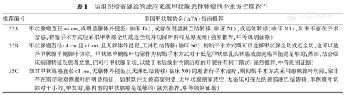 | 35A | 甲状腺癌直径>4 cm,或明显腺体外侵犯(临床T4),或存在明显淋巴结转移(临床N1),或远处转移(临床M1),如果不存在手术禁忌,初始手术方式应采取甲状腺全切或近全切并切除所有可见原发灶(强烈推荐,中等级别证据) |