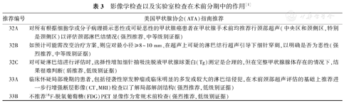 | 32C | 对可疑淋巴结进行评估时,选择性增加细针抽吸洗脱液甲状腺球蛋白(Tg)测定是合理的,但在完整甲状腺腺体存在的情况下,结果很难判断(弱推荐,低级别证据) |