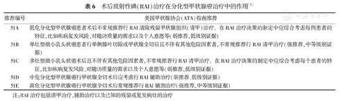| 51A | 低危分化型甲状腺癌患者术后不常规推荐行RAI清除残留甲状腺组织(清甲)治疗。在RAI治疗决策的制定中应综合考虑每例患者的特征,比如疾病复发风险、对随访质量的需求以及个人意愿等(弱推荐,低级别证据) |