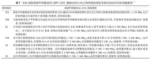 | 55B | 当患者接受低于甲状腺全切或近全切术后怀疑残留甲状腺体积相对较大时或拟行辅助治疗者,可能需要考虑高剂量治疗(弱推荐,低级别证据) |