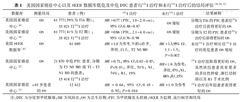 | 美国国家癌症中心[18] | OS | 61 777(59%为T1b期);35 921行131I治疗 | HR=0.77 (PTC, 1.0~2.0 cm); 95% CI:0.68~0.87 | OS缩短 | 分期为T1b的PTC患者经131I治疗后获得更好的OS |