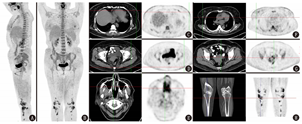以皮肤病变为首发症状的IVLBCL易误诊,需与以皮肤大片红肿为主要临床表现的疾病相鉴别。(1)皮肤与内脏均受累的疾病:如脂膜炎,常发生于链球菌感染后,是发生于脂肪组织的无菌性炎性反应,临床表现以反复发作的皮下痛性结节或斑块为主。发病部位以皮肤最多,也可出现多种内脏受累,如肠系膜、大网膜[10],病灶FDG摄取增高[11],与IVLBCL相似。本例患者抗链球菌溶血素"O"正常,可排除链球菌感染,且PET/CT显像提示肠系膜、大网膜等脂膜炎常见部位未受累及,故不考虑为脂膜炎。(2)单纯皮肤受累疾病:如结节性红斑、结节性血管炎,是真皮血管或脂肪组织受累的炎性皮肤病,中青年女性多见,慢性病程,反复发作。典型表现为发生于双下肢的对称性红斑或触痛结节,以小腿伸侧多见,也可发生于大腿或上肢[12,13],皮肤病变表现与IVLBCL相似但不累及内脏,由此可与IVLBCL相鉴别。本例患者以发热、皮肤红肿为首发表现,其他脏器已有累及但无相关临床症状,临床表现特异性不高,仅凭这些容易误诊。通过18F-FDG PET/CT显像可明确全身病变范围,引导最佳活检位置,给临床提供全面的诊断与辅助诊断信息,有助于IVLBCL的早期诊断、及时治疗,从而提高患者的生存质量,延长生存期。