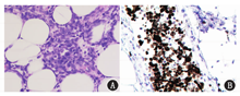患者女,55岁,因"双下肢皮肤红肿1个月,发热、双乳皮肤红肿2周"入院。既往史:3年前曾出现双踝部皮肤红肿,经中医治疗后消失。近半年反复上呼吸道感染。患者1个月前无明显诱因出现对称性双下肢皮肤红肿,位于膝盖以上双侧股内侧,初为3 cm×3 cm对称性皮肤红斑,皮肤红肿、触痛,温度增高,偶瘙痒,中药治疗效果不佳。2周前进食海鲜后发热,最高39 ℃,伴畏寒、寒战,并出现双侧乳房对称性皮肤红肿,全身乏力,此后每日低热,上部躯体出汗。1年内体质量减轻5 kg。体格检查:全身触痛,双侧股内侧、双侧乳房皮肤红肿,有触痛,双下肢对称性非凹陷性水肿。余无特殊。实验室检查:Hb 92[110~150(括号内为正常参考值范围,下同] g/L,PLT 145(100~300)×109/L,凝血功能正常。乳酸脱氢酶(lactate dehydrogenase, LDH)1 302(109~245) U/L,天冬氨酸氨基转移酶42 (10~28) U/L,C反应蛋白43(<8) mg/L,血红细胞沉降率(简称血沉) 37(0~20) mm/1 h,铁蛋白554(4.63~204) μg/L,肌酐42(45~84) μmol/L,自身抗体谱均阴性,抗链球菌溶血素"O"正常,肿瘤标志物正常。骨髓细胞形态学检查示造血组织增生活跃,容积比50%,三系比例大致正常,未见肿瘤。