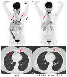 最近发表了使用仑伐替尼治疗晚期DTC的Ⅲ期临床试验数据[36]。使用RECIST 1.1评价,治疗组的总有效率为65%,安慰剂组为2%,2组中位无进展生存期分别为18和4个月。此外,在这项试验中,由于患者病情进展后才改用开放标签药物,也未能观察到2组总生率差异有统计学意义。然而,在亚组分析中,与安慰剂组相比,治疗组中65岁或65岁以上患者的总生存率有所改善[35]。1例仑伐替尼的治疗效果示例如图1。由于毒性的原因,对82%的患者必须改变给药方式。2015年2月,该药物在美国被批准用于治疗局部复发或转移性的进展性RAIR DTC患者。目前,仑伐替尼治疗RAIR DTC患者的Ⅱ期临床试验正在进行,以评估每天18 mg的口服起始剂量能否在改善毒性作用的同时获得与常规24 mg起始剂量相当的疗效。