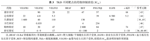 注:BRAF=B-Raf原癌基因丝/苏氨酸蛋白激酶,c-KIT=肥大细胞/干细胞生长因子受体,EGFR=表皮生长因子受体,PDGFR=血小板衍生生长因子受体,RET=转染期间重排,TKIs=酪氨酸激酶,VEGFR=血管内皮生长因子受体;较低的IC50值表明抑制作用更强