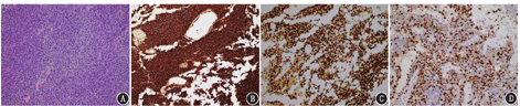 患者女,38岁,因"哺乳期发现胸壁无痛性肿块3个月余,未予重视,近期进行性增大"就诊。体格检查:右胸壁皮下肿物,质硬。实验室检查:神经元特异性烯醇化酶(neuron-specific enolase, NSE) 114.4(正常参考值范围:0~16.3)×103 ng/L。B超示右侧胸壁乳腺后方骨表面实质性占位;CT示右侧胸壁软组织肿块,密度均匀,增强扫描后轻度强化。行超声引导下胸壁穿刺,光学显微镜下见蓝色小圆细胞恶性肿瘤;免疫组织化学分析(图1):CD99(弥漫+++)、NKX2.2(神经内分泌标志物;弥漫+++)、B淋巴细胞瘤(B-cell lymphoma, Bcl)-2(+)、Bcl-6(+)、细胞周期素Cyclin-D1(+)、B淋巴细胞抗原受体复合物CD79a(少+)、CD56(+)、细胞增殖核抗原Ki-67(70%+)、平滑肌肌动蛋白(smooth muscle actin, SMA;-)、结蛋白(Desmin, Des; -)及白细胞共同抗原(leucocyte common antigen, LCA; -);原位杂交:尤文肉瘤(Ewing′s sarcoma, EWS)断点区1(EWS breakpoint region 1, EWSR1)基因约60%,病理提示为骨外EWS(extraskeletal EWS, E-EWS)。为明确分期行18F-脱氧葡萄糖(fluorodeoxyglucose, FDG) PET/CT(uMI510型,上海联影医疗科技有限公司)显像,结果示右侧胸壁糖代谢异常增高的肿块,局部突入胸腔,边缘尚光整,密度均匀,大小约为71.1 mm×32.4 mm,最大标准摄取值(maximum standardized uptake value, SUVmax)约为17.1,毗邻肋骨骨质密度稍增高(图2)。骨髓穿刺活组织检查(简称活检)未见E-EWS累及骨髓证据。综合病理学和影像学检查临床诊断为E-EWS(T2N0M0G3,Ⅲ期)。排除禁忌证后,给予患者长春新碱+阿霉素+环磷酰胺(vincristine+ doxorubicin+ cyclophosphamide, VAC)/异环磷酰胺+依托泊苷(ifosfamide+ etoposide, IE)交替方案化疗,6个周期后,行18F-FDG PET/CT评价其疗效。PET/CT显像示右侧胸壁糖代谢异常增高的肿块,边缘尚光整,较前明显缩小,糖代谢较前减低,大小为34.0 mm×15.7 mm,SUVmax为10.5(图3)。