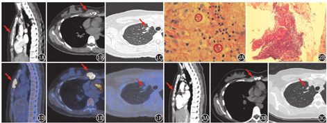 患者女,24岁,因"胸骨体疼痛3个月余,检查发现胸骨体肿瘤2个月余"入院。体格检查:胸骨体中段可见一包块,质中,无红肿及压痛,与周围组织分界不清楚,双肺叩诊清音,听诊双肺呼吸音对称、清晰,未闻及干湿性啰音。实验室检查未见明显异常。为明确感染扩散情况,行胸部增强CT检查及18F-FDG PET/CT显像(图1)。为明确肿块性质,行B超引导下胸骨体肿物穿刺活组织检查,术后病理考虑为球孢子菌性肉芽肿(图2)。后予以口服伊曲康唑(每日2次,每次200 mg)抗真菌治疗,治疗3个月后复查胸部CT(平扫+增强;图3)。追问病史得知患者因求学曾在美国华盛顿州居住7年,而华盛顿州是球孢子菌感染的高发地带[3]。本例患者的肿块病理诊断为球孢子菌性肉芽肿,PET/CT检查发现疾病累及右侧胸大肌及右肺上叶尖段,提示球孢子菌感染时可行18F-FDG PET/CT检查以评估疾病的播散范围,以减少漏诊、误诊的发生[4]。