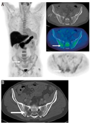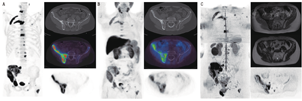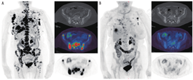 2.18F-胆碱和11C-胆碱PET/CT。18F-FDG在激素敏感性前列腺癌中往往显示低摄取,而在去势抵抗性前列腺癌中却有着较高程度的18F-FDG摄取,18F-FDG可用于监测全身治疗反应[47]。为了更准确分期,研究者对高摄取可替代显像剂的应用更感兴趣。前列腺癌与胆碱转运体、胆碱激酶表达上调以及胆碱整合进入增殖肿瘤的细胞膜有关。11C和18F标记的胆碱均可用于高风险前列腺癌的分期诊断和生化复发评价(图2B)。活动性成骨性骨转移灶的胆碱活跃程度较正常骨髓组织高,而且少见的溶骨性的转移灶也表现出更高的摄取[48]。与骨显像相比,胆碱PET/CT在高风险患者分期[49,50]及生化复发的评价上有更高的准确性[51]。