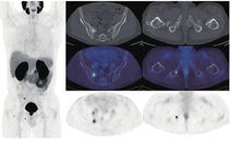 另一种已被批准用于前列腺癌生化复发监测的代谢性PET显像剂是18F-环丁氨酸(fluciclovine),这种亮氨酸的合成氨基酸类似物在肿瘤细胞中摄取增加,可反映出肿瘤细胞氨基酸转运、蛋白质和核苷酸合成增加。临床前和临床研究表明,尽管18F-fluciclovine在正常骨髓有弥漫性摄取的现象,但其仍能成功地用于骨转移显像[20,21]。其他显像剂也已显示出在骨和软组织转移显像中的有效性,包括靶向特定受体或抗原显像剂。用68Ga标记的前列腺特异膜抗原(prostate specific membrane antigen, PSMA)的小分子抑制剂显示出具有正常骨髓中活性低、骨转移肿瘤与本底对比度高的优点[22]。