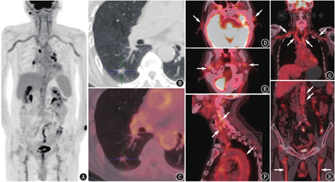 患者男,86岁,主诉贫血2年,纳差6个月,视野缺损3个月。患者2年前体检时发现贫血,当时无特殊不适,未予重视;3个月前无明显诱因出现右眼视野缺损及视力减退,本院眼眶MRI示:视神经信号未见明显异常,眼科门诊诊断:考虑前部缺血性视神经病变。2个月前患者进食时双侧咬肌处疼痛,进食量较前减少,食欲不佳。本院胸腹盆部CT平扫提示右肺下叶实性结节;血常规示WBC、PLT大致正常,Hb 104(正常参考值范围:120~160) g/L;便潜血阳性(×1次);血红细胞沉降率(erythrocyte sedimentation rate, ESR)92(正常参考值范围:0~15) mm/1 h、C反应蛋白(C-reactive protein, CRP)22.23(提示急性炎性反应:>8.00) mg/L,结核感染T细胞斑点试验(T-cell spot of tuberculosis test, T-SPOT.TB)阴性,抗核抗体阴性,肿瘤标志物正常。既往史:原发性高血压10余年,糖尿病6年,高脂血症10余年,经药物治疗病情控制尚可;发现前列腺增生4年余。体格检查:双侧颈部、锁骨上可闻及血管杂音。颈动脉及椎动脉超声提示双侧颈动脉粥样硬化伴斑块形成,左侧颈外动脉轻度狭窄;右侧椎动脉阻力增高。临床为明确右肺结节性质及探查全身情况行18F-FDG PET/CT显像。