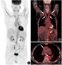 18F-FDG PET/CT除用于肿瘤性疾病外,也是炎性疾病诊断和评估的重要方法。18F-FDG PET/CT可以评价大动脉炎/巨细胞动脉炎患者受累血管壁的代谢情况,有时可以意外诊断大动脉炎/巨细胞动脉炎[1]。在不明原因发热的患者中,18F-FDG PET/CT可能发现尚未诊断的大动脉炎/巨细胞动脉炎,从而明确发热的原因(图2)。一般而言,18F-FDG PET/CT对大动脉炎/巨细胞动脉炎的诊断性能较好,诊断灵敏度为80%~90%,特异性为73%~98%[2]。但用该方法评估大动脉炎/巨细胞动脉炎时,需要注意以下问题。