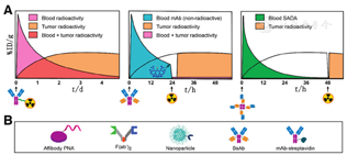注:a运用先进加速器;Affibody-PNA为亲和体-肽核酸,DOTATATE为1,4,7,10-四氮杂环十二烷-1,4,7,10-四乙酸(DOTA)-D-苯丙氨酸1-酪氨酸3-苏氨酸8-奥曲肽,HP2为杂交探针2,HSG为组氨酸-琥珀酰-甘氨酸,IEDDA为逆电子需求的Diels-Alder点击化学反应,SADA为自组装-解组装,Tz为四嗪;所有给予人源肿瘤皮下荷瘤免疫缺陷小鼠的治疗均通过静脉注射