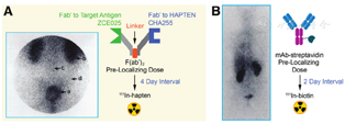 1993~1998年间,Immunotech公司使用抗CEA单抗/金属螯合物特异性单抗BsAb进行了临床PRID研究。其中的金属螯合物特异性单抗可靶向In-二乙撑三胺五乙酸(diethylene triamine pentaacetic acid, DTPA)。研究发现使用二价111In-diDPTA-酪氨酰-赖氨酸放射性半抗原[diDTPA(In)-hapten]的PRID在结直肠癌[63]、甲状腺髓样癌[64,65]以及小细胞肺癌[66]中可获得高对比度的图像。然而使用的鼠源BsAb导致在约60%患者中检测到了抗药物抗体[63]。此外,在使用131I的PRIT中,通过亲和处理合成131I-diDTPA(In)-hapten和其类似物,用于螯合99Tcm和188Re[67,68,69]。在人甲状腺髓样癌荷瘤裸鼠中,相比较传统的RIT,使用92.5 MBq的131I-diDTPA(In)-hapten的PRIT可显著延迟肿瘤生长,且毒性更低[70]。这种方法也在患者体内进行了评估。