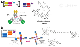 2.BsAb预靶向策略。DNL系统在临床前(主要用于开发新型半抗原)和临床中得到了广泛的研究,目前已开展了多项应用DNL法制备的抗CEA TF2和放射性标记的IMP288的试验。已借助DNL法研发的2种新型半抗原包括了1种可在多种肿瘤手术中发挥影像导航作用的新型放射性/近红外多模态半抗原RDC018[106],以及1种用于α-PRIT的213Bi-IMP288[107]。