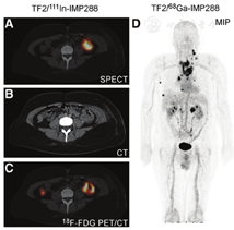 随后,2015年报道了1项在9例表达CEA的小细胞肺癌患者中使用111In/177Lu-IMP288的临床Ⅰ期PRIT研究[111],并于2016年报道了在甲状腺髓样癌患者中首次使用TF2/68Ga-IMP288的PRID研究[112]。在过去的2年里,在结直肠癌患者[113]和HER2阴性/CEA阳性的转移性乳腺癌患者中开展了使用TF2/68Ga-IMP288的临床PRID研究[114]。2021年,Bodet-Milin等[115]公布了在甲状腺髓样癌患者中使用TF2/68Ga-IMP288的临床PRID数据,证明了其对转移病灶检测的灵敏度优于18F-L-二羟基苯丙氨酸PET/CT显像。近期有关TF2/IMP288的临床PRID研究的精选案例见图4。