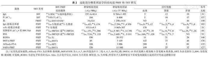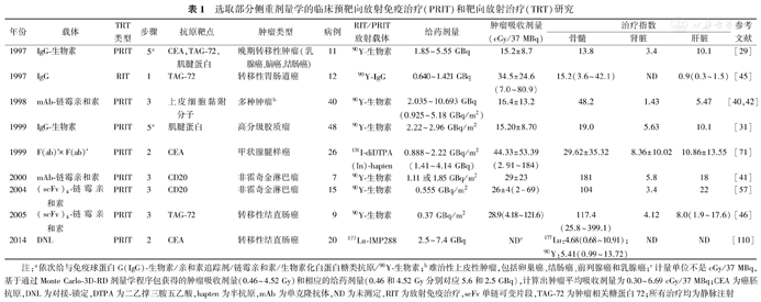 注:a依次给与免疫球蛋白G(IgG)-生物素/亲和素追踪剂/链霉亲和素/生物素化白蛋白糖类抗原/90Y-生物素;b难治性上皮性肿瘤,包括卵巢癌、结肠癌、前列腺癌和乳腺癌;c计量单位不是cGy/37 MBq,基于通过Monte Carlo-3D-RD剂量学程序包获得的肿瘤吸收剂量(0.46~4.52 Gy)和相应的给药剂量(0.46和4.52 Gy分别对应5.6和2.5 GBq),计算出肿瘤平均吸收剂量为0.30~6.69 cGy/37 MBq;CEA为癌胚抗原,DNL为对接-锁定,DTPA为二乙撑三胺五乙酸,hapten为半抗原,mAb为单克隆抗体,ND为未测定,RIT为放射免疫治疗,scFv单链可变片段,TAG-72为肿瘤相关糖蛋白72;所有治疗均为静脉注射