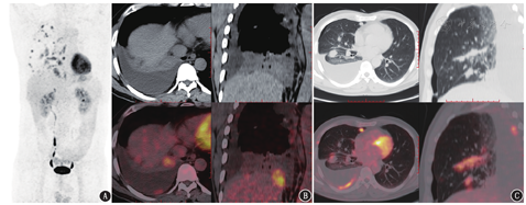 患者男,48岁,主诉咳嗽、咳痰1年余,肺部占位1周。2017年患者无明显诱因出现咳嗽,咳白色黏痰。2018年6月外院CT提示右肺下叶占位。入院体格检查右肺呼吸音消失。血红细胞沉降率54[正常参考值范围(下同):0~21] mm/1 h,糖类抗原(carbohydrate antigen, CA)72-4>300.00(0~6.9) kU/L,癌胚抗原12.69(0~5) μg/L。肺穿刺提示印戒细胞癌。胃镜检查阴性。为明确原发灶,行18F-FDG PET/CT(美国GE Discovery 710型)显像,结果示右肺多发类圆形或圆形密度增高影,最大者位于右肺下叶不张肺内,部分结节周围伴斑片及条索影,FDG摄取增高;右侧脏层及壁层胸膜结节状增厚,最大者位于右侧叶间裂,FDG摄取增高,考虑右下肺癌伴右肺及右侧胸膜转移(图1)。临床诊断为原发性肺印戒细胞癌。以"多西他赛(120 mg,第1天)+洛铂(50 mg,第1天)"化疗6周期后左肺进展,基因检测示间变性淋巴瘤激酶(anaplastic lymphoma kinase, ALK)突变,口服克唑替尼后部分缓解,随访36个月后失访。